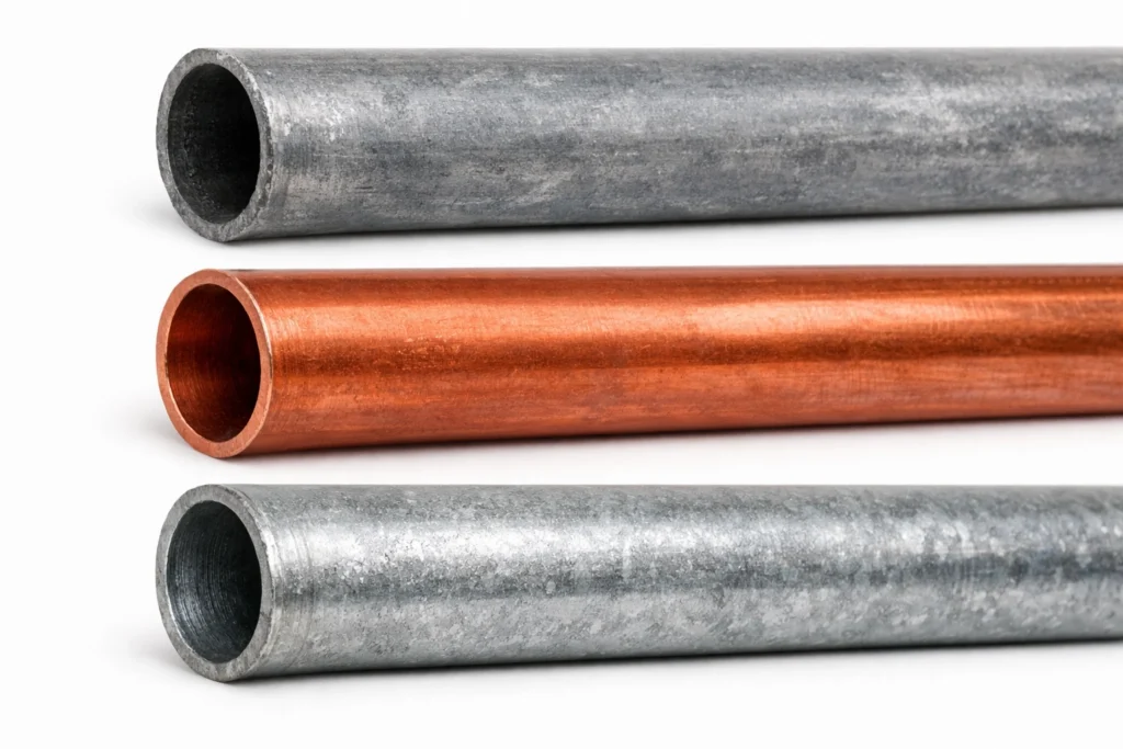 - Galvanized steel pipes are silver-gray with threaded connections